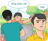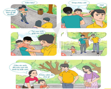 Bạn nhỏ đang bị một người là mặt bắt cóc, khống chế (“Cấm kêu”) và bạn nhỏ đang tìm cách để có thể thoát khỏi tên xấu này.