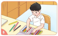 Bạn nam đang sắp xếp bút vào hộp sau khi dùng. Đây là việc làm bảo quản, giữ gìn đồ dùng cá nhân, giúp cho bút được bền đẹp, tránh bị gãy hoặc bị thất lạc. Chúng ta đồng tình với việc làm này.