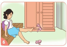 Bạn nữ dùng chân vứt đôi giày. Đây là việc làm không tốt cho đồ dùng cá nhân vì sẽ khiến cho đôi giày nhanh bị sờn, rách, hỏng. Chúng ta không đồng tình với việc làm này.