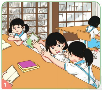 Các bạn đang đọc sách ở thư viện. Hai bạn nữ ngồi gần nhau đang tranh giành quyển sách gây mất trật tự, ảnh hưởng đến các bạn đọc xung quanh. Hai bạn đã không tuân thủ đúng theo quy định của thư viện. Chúng ta không đồng tình với việc làm trên.