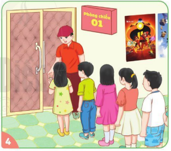 Các bạn đang xếp hàng để vào phòng chiếu phim. Việc làm này tuân thủ đúng theo quy định ở rạp chiếu phim nên chúng ta đồng tình.