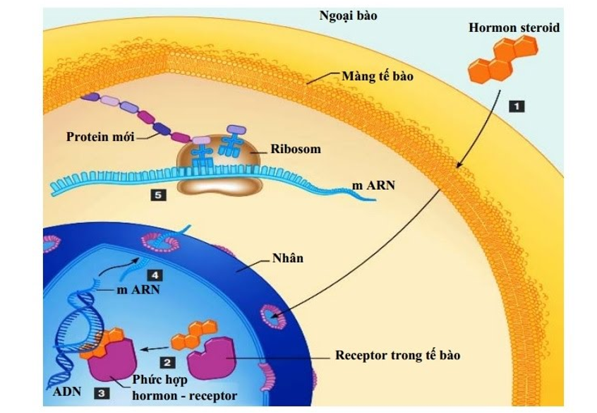 Hormone sinh dục (steroid) tác động lên tế bào đích bằng cách liên kết với thụ thể nằm trong tế bào chất và làm thay đổi sự hoạt động của gene.
