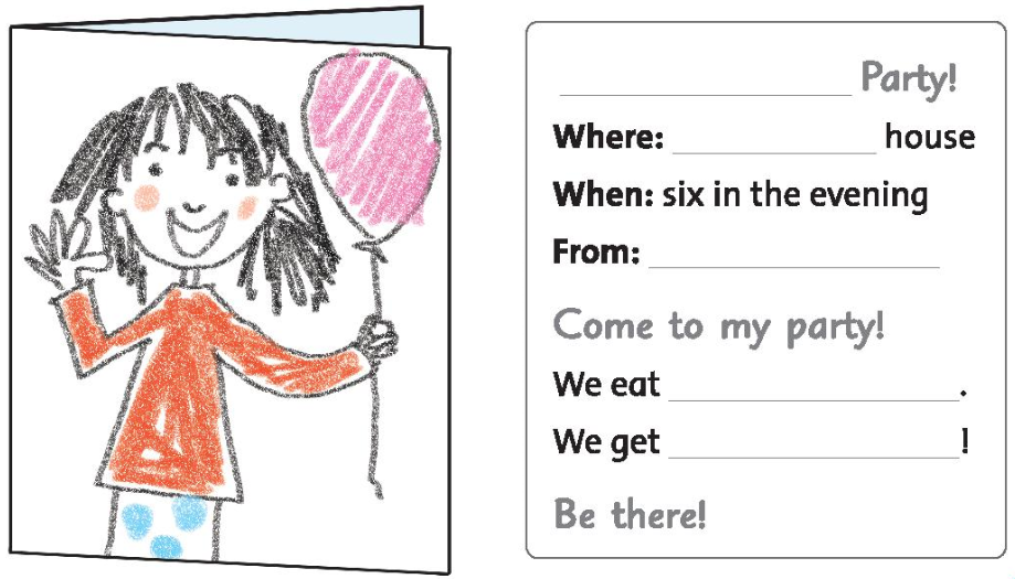(Làm một tấm thiệp cho buổi tiệc. Viết.)