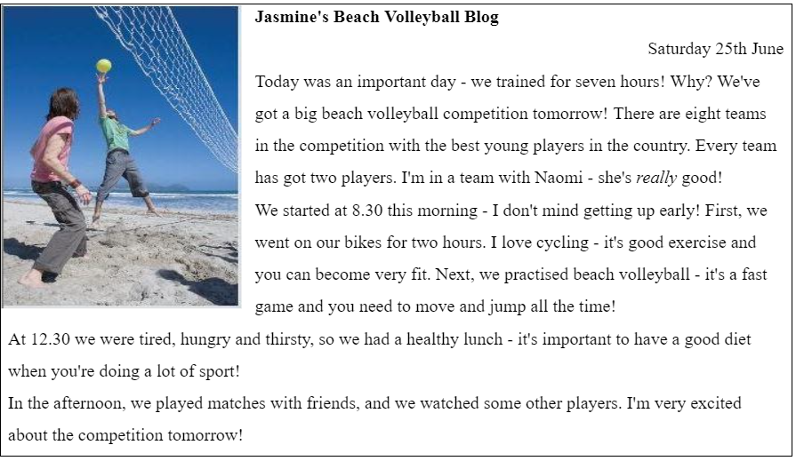 Hôm nay là một ngày quan trọng – chúng tôi đã tập luyện trong bảy giờ! Tại sao? Chúng tôi có một cuộc thi bóng chuyền bãi biển lớn vào ngày mai! Có tám đội tham gia tranh tài với các cầu thủ trẻ xuất sắc nhất trong nước. Mỗi đội đều có hai cầu thủ. Tôi ở trong đội với Naomi – cô ấy thực sự rất giỏi!
