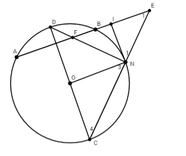 $\begin{array}{l}\widehat {IFN} = \dfrac{1}{2}\left( {sđ\overparen{BN} + sđ\overparen{AD}} \right) \\= \dfrac{1}{2}\left( {sđ\overparen{BN} + sđ\overparen{BD}} \right)\\ = \dfrac{1}{2}sđ\overparen{DN} = \widehat {INF}\end{array}$