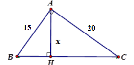 \(\dfrac{1}{{A{H^2}}} = \dfrac{1}{{A{B^2}}} + \dfrac{1}{{A{C^2}}}\)\( \Rightarrow AH = \dfrac{{AB.AC}}{{\sqrt {A{B^2} + A{C^2}} }} = \dfrac{{15.20}}{{\sqrt {{{15}^2} + {{20}^2}} }} = 12\)