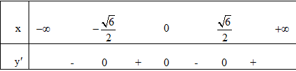 \(\begin{array}{l}y’ = 4{x^3} – 6x\\y’ = 0 \Rightarrow 4{x^3} – 6x = 0\\ \Leftrightarrow \left[ \begin{array}{l}x = 0\\x = – \dfrac{{\sqrt 6 }}{2}\\x = \dfrac{{\sqrt 6 }}{2}\end{array} \right.\end{array}\)