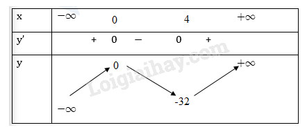 \(\begin{array}{l}y’ = 3{x^2} – 12x\\y’ = 0 \Leftrightarrow 3{x^2} – 12x = 0 \Leftrightarrow \left[ \begin{array}{l}x = 0\\x = 4\end{array} \right.\end{array}\)