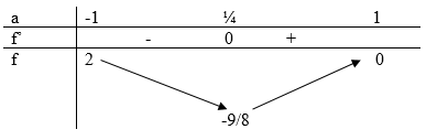 \(\begin{array}{l} – \frac{9}{8} \le f(a) \le 2 =  > AB = 64 + d\\ =  > 64 + 8.\left( { – \frac{9}{8}} \right) \le AB \le 64 + 8.2\\ =  > 55 \le AB \le 80\end{array}\)