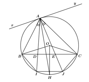 (\(D\) nằm giữa \(B\)\(E\)) sao cho \(\angle DAB = \angle EAC\). Các tia \(AD\)\(AE\) tương ứng cắt đường tròn \(\left( O \right)\) tại  \(I\)\(J\).