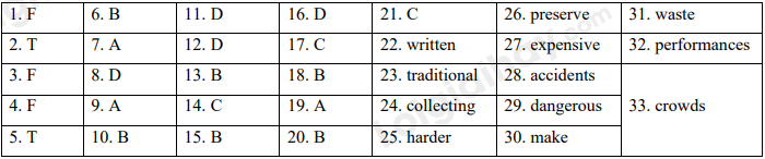 Second, festivals can be dangerous. People may drink a lot during a festival and cause road (28)________. In many festivals, there are races like cow-racing and elephant racing which may be (29)___________, especially for children. Moreover, in some festivals, when people rush to see the events, they may also (30)__________ other people to get hurt. Third, festivals may affect the environment. After a festival, the roads are full of colorful paper, flowers, (31)____________ cans or bottles that people throw away. Trees along the roadsides may be damaged by the (32)____________ . Furthermore, the noise from music and other (33)_________ also cause noise pollution.