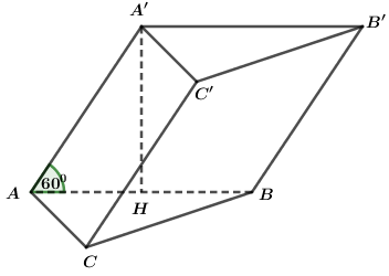 Vậy thể tích khối lăng trụ là : \(V = {S_{ABC}}.A’H = \frac{{{a^2}\sqrt 3 }}{4}.\frac{{a\sqrt 3 }}{2} = \frac{{3{a^3}}}{8}\).