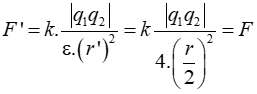 Hai điện tích điểm đặt cách nhau một khoảng r trong không khí thì hút nhau một lực F Đưa chúng vào trong dầu có hằng số điện môi ε = 4 chúng cách nhau một khoảng r’ = r/2 thì lực hút giữa chúng là: