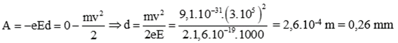 Một electron chuyển động dọc theo đường sức của một điện trường đều. Cường độ điện trường E = 1000 V/m. Vận tốc ban đầu của electron là 3.105 m/s, khối lượng của elctron là 9,1.10-31kg. Tại lúc vận tốc bằng không thì nó đã đi được đoạn đường bao nhiêu, tính theo đơn vị mm)