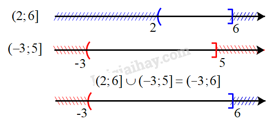 Hợp của hai tập hợp: \((2;6] \cup ( – 3;5] = ( – 3;6]\)