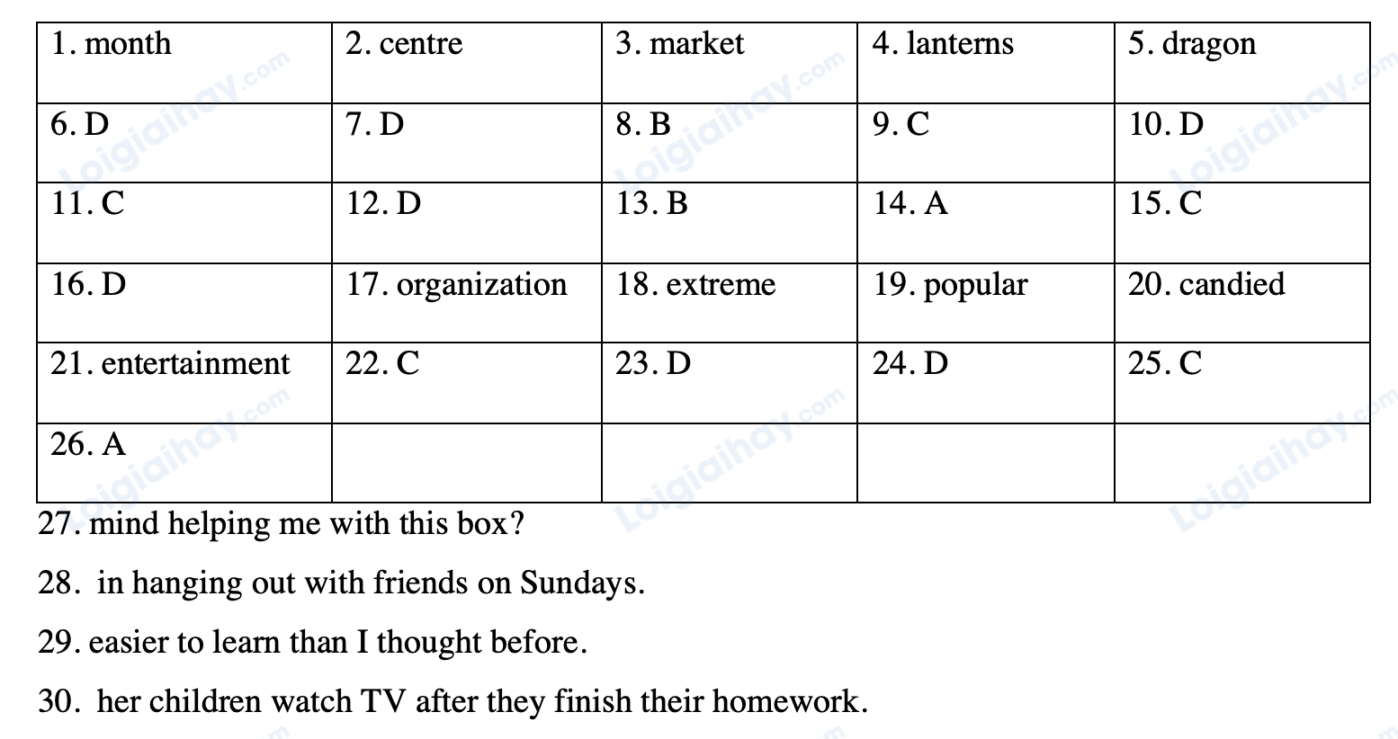 Listen to Andy and Ly talking about the Mid-Autumn Festival. Fill in each gap with only ONE WORD. Choose the word choose the word whose underlined part is pronounced differently from the others. Choose the word which has a different stress pattern from the others.