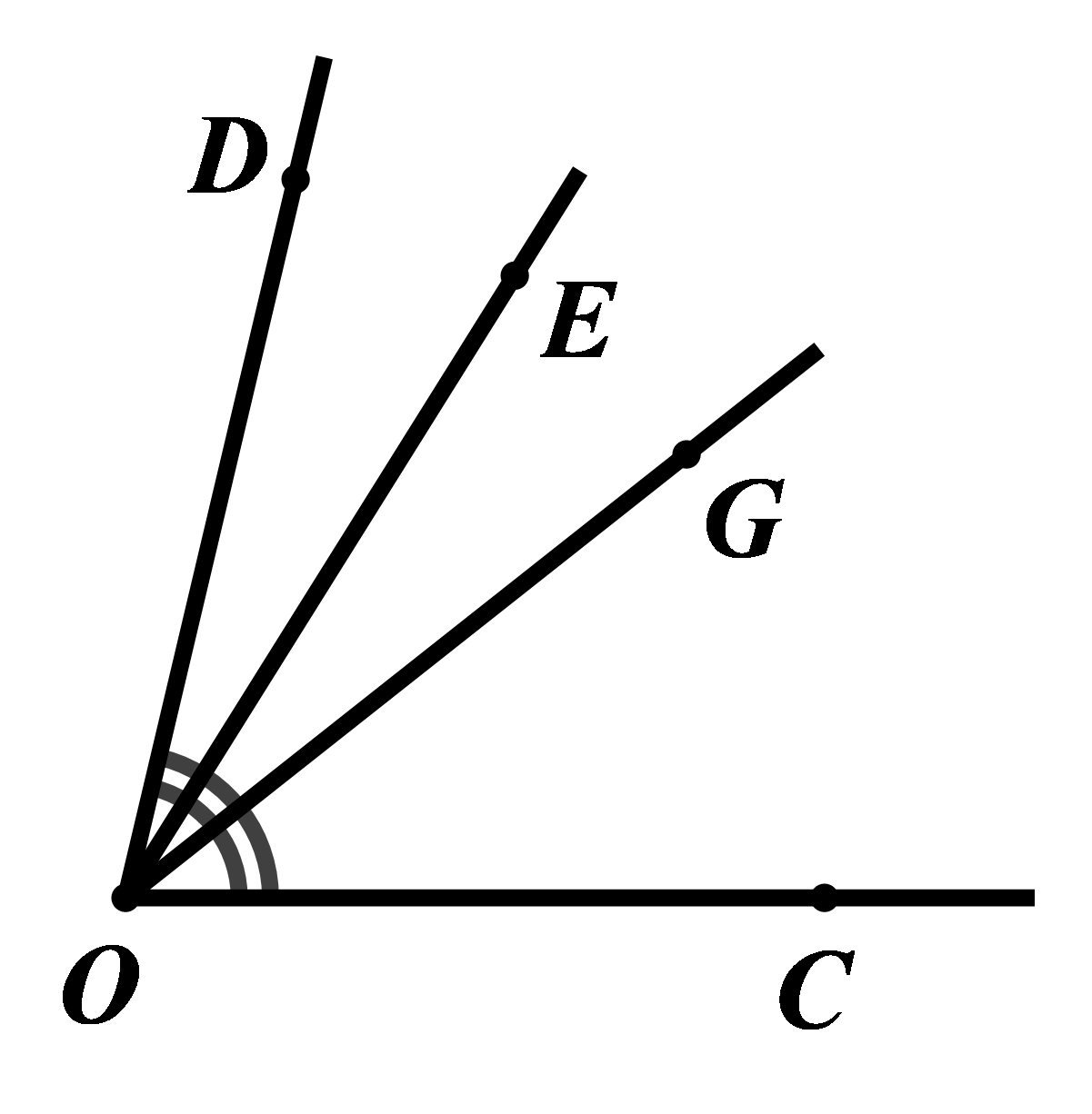 Quan sát hình vẽ bên dưới, có \(\angle COD = {80^0};\angle COE = {60^0}\), tia \(OG\) là tia phân giác của\(\angle COD\).
