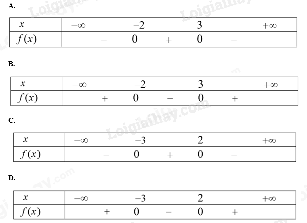 Câu 10: Bảng xét dấu nào sau đây là của tam thức \(f(x) = – {x^2} – x + 6\)?