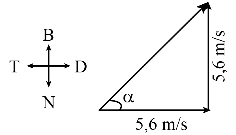Vận tốc tổng hợp: \(v = \sqrt {5,{6^2} + 5,{6^2}}  = 7,92m/s\) theo hướng Đông Bắc