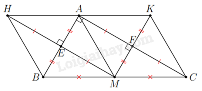 b) Theo a) suy ra \(HA\parallel BC\), \(AK\parallel MC\) \( \Rightarrow \) \(H\), \(A\), \(K\) thẳng hàng. Lại có \(AH = AM = AK\) \( \Rightarrow \) \(H\), \(K\) đối xứng với nhau qua \(A\).
