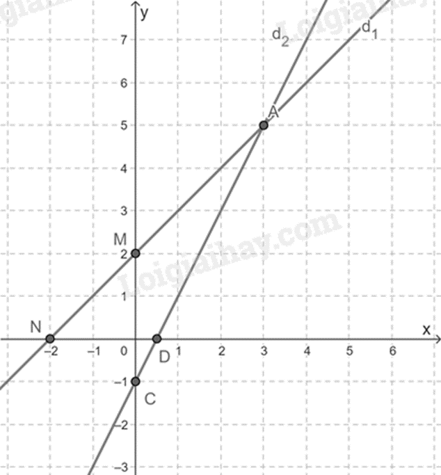 c) Xác định a, b của hàm số bậc nhất y = ax + b, (a \( \ne \) 0) biết rằng đồ thị hàm số \({d_3}\) của hàm số này song song với \({d_1}\) và cắt đường thẳng \({d_2}\) tại B có hoành độ bằng -1.