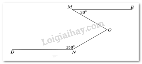 Cho hình vẽ dưới, biết số đo các góc \(\widehat {EMO} = 30^\circ \), \(\widehat {DNO} = 150^\circ \), \(\widehat {MON} = 60^\circ \). Chứng minh \(ME//DN\).