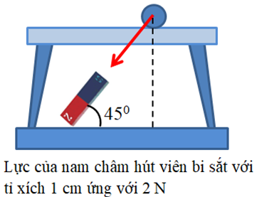 D. Lực nam châm hút viên bi sắt có phương nghiêng với phương nằm ngang một góc 450, chiều hướng từ trên xuống, cường độ 2 N.