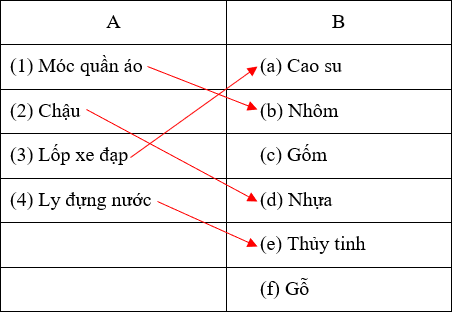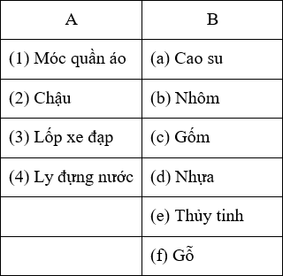 Em hãy nối các vật thể ở cột A tương ứng với vật liệu ở cột B.