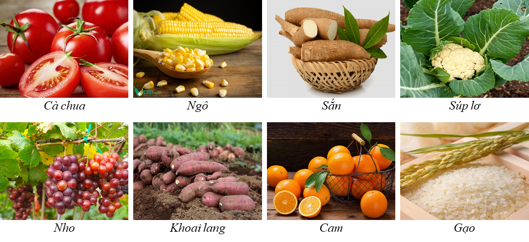 Vậy các loại lương thực trong hình vẽ trên là: ngô, sẵn, khoai lang, gạo (4 loại).