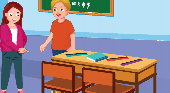Toby đang cho Pat xem lớp học của cậu ấy. Có một cái bàn học và 2 chiếc ghế. Trên bàn học là một quyển sách và 3 chiếc thước kẻ. Quyển sách màu xanh dương. 3 chiếc thước kẻ màu xanh dương, đỏ và tím.