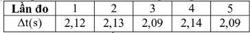\(\begin{array}{l}\overline {\Delta T}  = \frac{{\Delta {T_1} + \Delta {T_2} + … + \Delta {T_5}}}{5}\\\,\,\,\,\,\,\,\, = \frac{{\left( {2,12 – 2,11} \right) + \left( {2,13 – 2,11} \right) + \left( {2,11 – 2,09} \right) + \left( {2,14 – 2,11} \right) + \left( {2,11 – 2,09} \right)}}{5}\\ \Rightarrow \overline {\Delta T}  = 0,02{\rm{s}}\end{array}\)