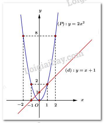 b) Hoành độ giao điểm của \(\left( P \right)\) và \(\left( d \right)\) là nghiệm của phương trình \(2{x^2} = x + 1 \Leftrightarrow 2{x^2} – x – 1 = 0\).