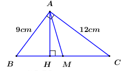 Cho tam giác \(ABC\) vuông tại \(A\) có đường cao \(AH\) và đường trung tuyến \(AM\). Biết \(AB = 9\,\,cm\), \(AC = 12\,\,cm\). Hãy tính \(BC,\,\,AH,\,\,AM\) và diện tích tam giác \(ABM\).