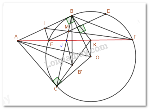 \( \Rightarrow \angle OKA = {90^0}\) \( \Rightarrow K\) thuộc đường tròn đường kính \(AO\) hay 5 điểm \(O,\,\,K,\,\,B,\,\,A,\,\,C\) cùng thuộc một đường tròn.