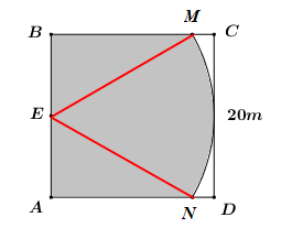 Diện tích hình quạt \(EMN\), bán kính \(20m\) là: \({S_{qEMN}} = \dfrac{{\pi {R^2}.60}}{{360}} = \dfrac{{\pi {{.20}^2}}}{6} = \dfrac{{200\pi }}{3}\,\,\left( {{m^2}} \right)\).