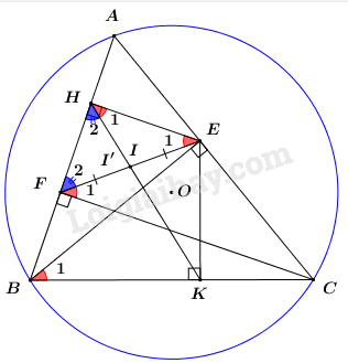 Theo câu a, tứ giác \(BHEK\) nội tiếp nên \(\angle {B_1} = \angle {H_1}\) (hai góc nội tiếp cùng chắn cung \(EK\)) (2).