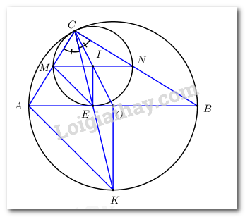 Ta có: \(\angle ACK = \angle BCK \Rightarrow \angle MCE = \angle NCE \Rightarrow sdcung\,\,ME = \,\,sdcung\,\,NE\) (hai góc nội tiếp bằng nhau chắn hai cung bằng nhau) \( \Rightarrow E\) là điểm chính giữa cung \(MN\) của \(\left( O \right) \Rightarrow IE \bot MN\) (3).