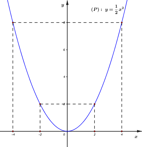 Do đó, \(\left( P \right):\,\,y = \dfrac{1}{2}{x^2}\) là đường cong đi qua các điểm: \(\left( { – 4;\,\,8} \right),\,\,\left( { – 2;\,\,2} \right),\,\,\left( {0;\,\,0} \right),\,\,\left( {2;\,\,2} \right),\,\,\left( {4;\,\,8} \right).\)