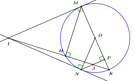 Cho đường tròn \(\left( O \right)\) và một điểm \(I\) nằm ngoài đường tròn. Qua \(I\) kẻ hai tiếp tuyến \(IM\) và \(IN\) với đường tròn \(\left( O \right).\) Gọi \(K\) là điểm đối xứng với \(M\) qua \(O.\) Đường thẳng \(IK\) cắt đường tròn \(\left( O \right)\) tại \(H.\)