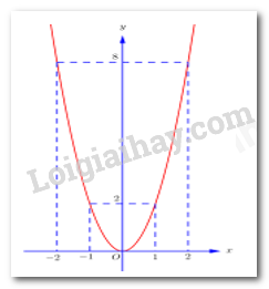 \( \Rightarrow \) Đồ thị hàm số \(y = 2{x^2}\) là đường cong đi qua các điểm \(\left( { – 2;8} \right);\,\,\left( { – 1;2} \right);\,\,\left( {0;0} \right);\,\,\left( {1;2} \right);\,\,\left( {2;8} \right)\).