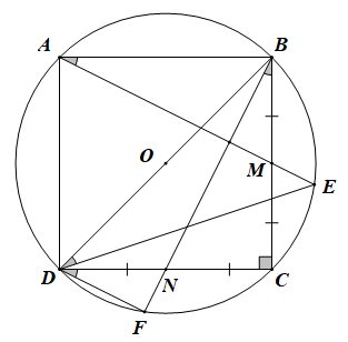 Câu 10. Cho hình vuông ABCD nội tiếp đường tròn tâm O. Gọi M, N lần lượt là trung điểm BC, CD. Đường thẳng AM, BN cắt đường tròn lần lượt tại E, F (như hình vẽ bên).