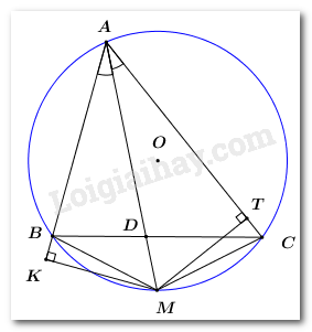 Cho \(\Delta ABC\) có ba góc nhọn nội tiếp đường tròn \(\left( O \right).\) Tia phân giác \(\angle BAC\) cắt cạnh \(BC\) tại \(D\) và cắt đường tròn \(\left( O \right)\) tại \(M.\) Gọi \(K\) là hình chiếu của \(M\) trên \(AB,\) \(T\) là hình chiếu của \(M\) trên \(AC.\) Chứng minh rằng: