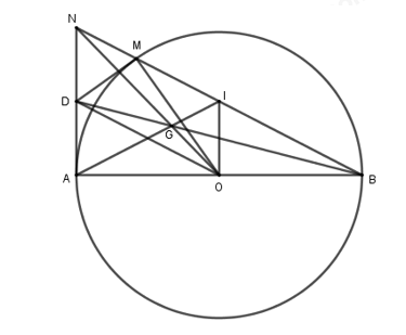 c) Qua \(O\) kẻ đường thẳng vuông góc với \(AB\) và cắt đường thẳng \(BM\) tại \(I\). Gọi giao điểm của \(AI\) và \(BD\) là \(G\). Chứng minh \(N,\,\,G,\,\,O\) thẳng hàng.