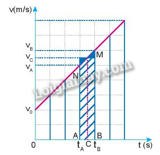 + Chọn một hình thang nhỏ bất kì trong hình. Vì vật chuyển động thẳng biến đổi đều nên trong khoảng thời gian nhỏ từ tđến t, có thể coi là chuyển động thẳng với vận tốc  (C nằm giữa A và B)