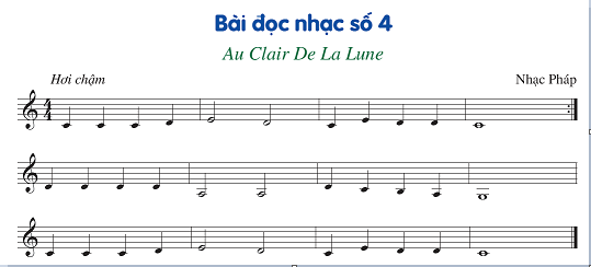 Bài đọc nhạc số 4 gồm hai nét nhạc. Tuy khác nhau về giai điệu nhưng tiết tấu hai nét nhạc giống nhau.
