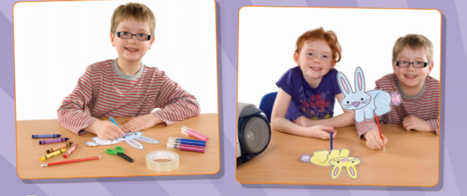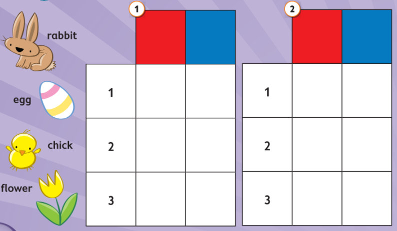 1. Bảng bên trái là thẻ riêng của học sinh A và bảng còn lại là để ghi thông tin của học sinh còn lại. Mỗi học sinh vẽ một con thỏ, một quả trứng, một con gà và một bông hoa trên bảng của riêng mình.