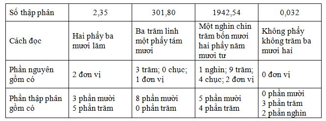 Đọc số thập phân, nêu phần nguyên, phần thập phân và giá trị theo vị trí của mỗi chữ số ở từng hàng. Viết số thập phân có: