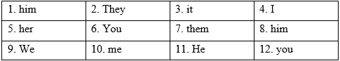 (Điền vào mỗi chỗ trống với đại từ nhân xưng làm chủ ngữ hoặc tân ngữ đúng.)