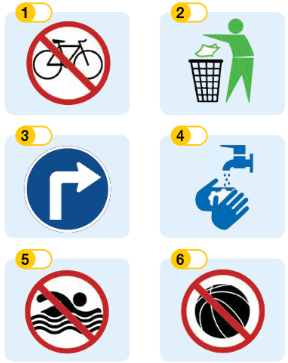 (Nối các biển báo (1-6) với các câu (A-F).)