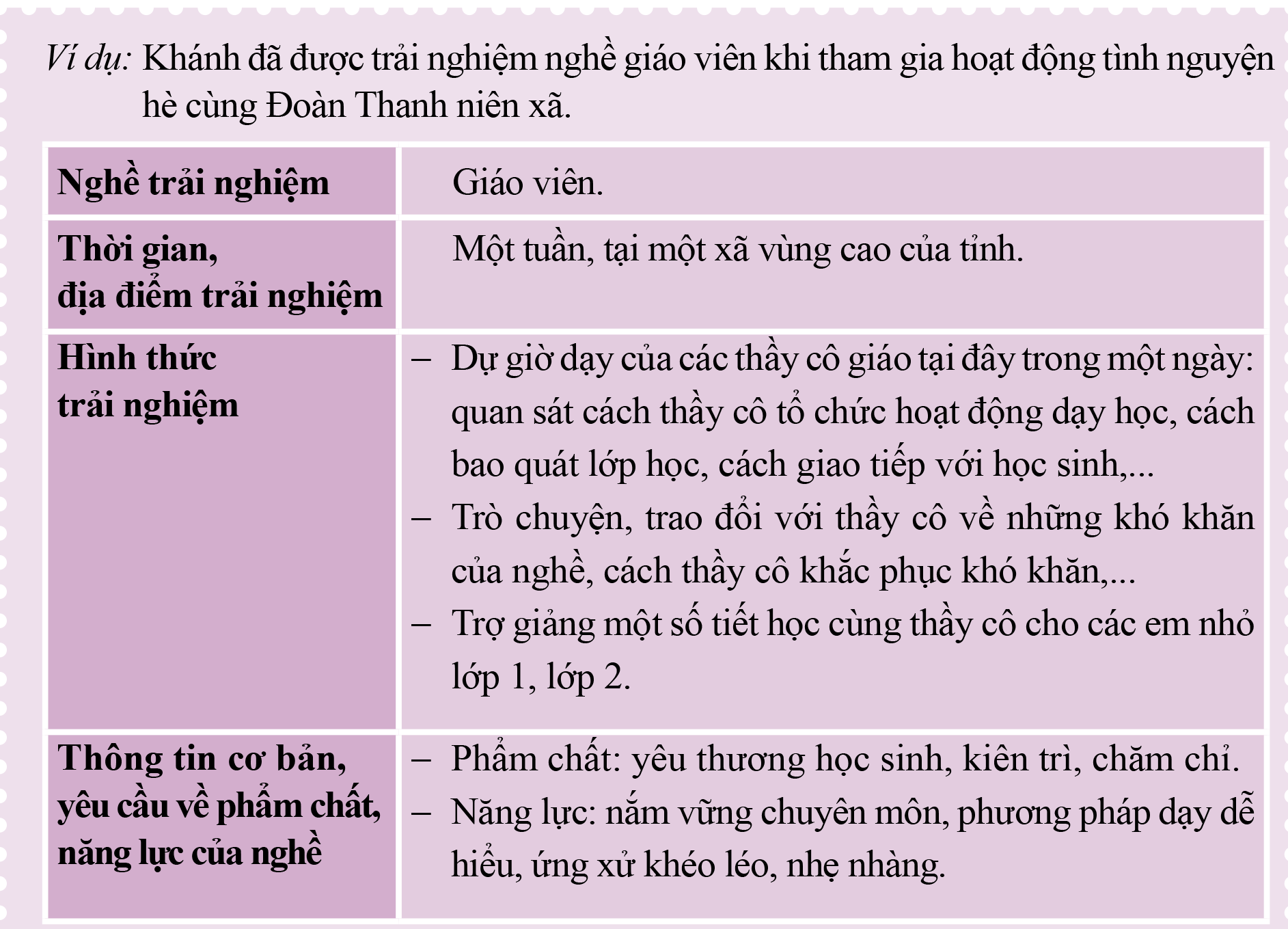 Lập kế hoạch trải nghiệm một nghề mà em quan tâm. Thực hiện kế hoạch trải nghiệm nghề nghiệp và chia sẻ kết quả. Gặp gỡ, trao đổi với nhà tuyển dụng mà em biết (chủ cơ sở sản xuất, kinh doanh, dịch vụ ở địa phương…) hoặc tìm kiếm thông tin mà nhà tuyển dụng cung cấp trên các trang thông tin để tìm hiểu những yêu cầu thực tế của nghề nghiệp.